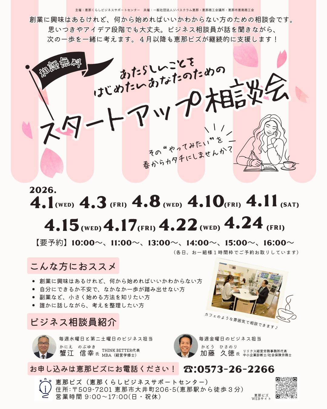恵那くらしビジネスサポートセンターは、岐阜県恵那市でのビジネスに関するの総合相談窓口です。専門のスタッフが無料で相談に応じます。ビジネス相談、経営相談、起業相談、就職支援など、お気軽にご相談下さい。あなたのチャレンジを全面サポートします!