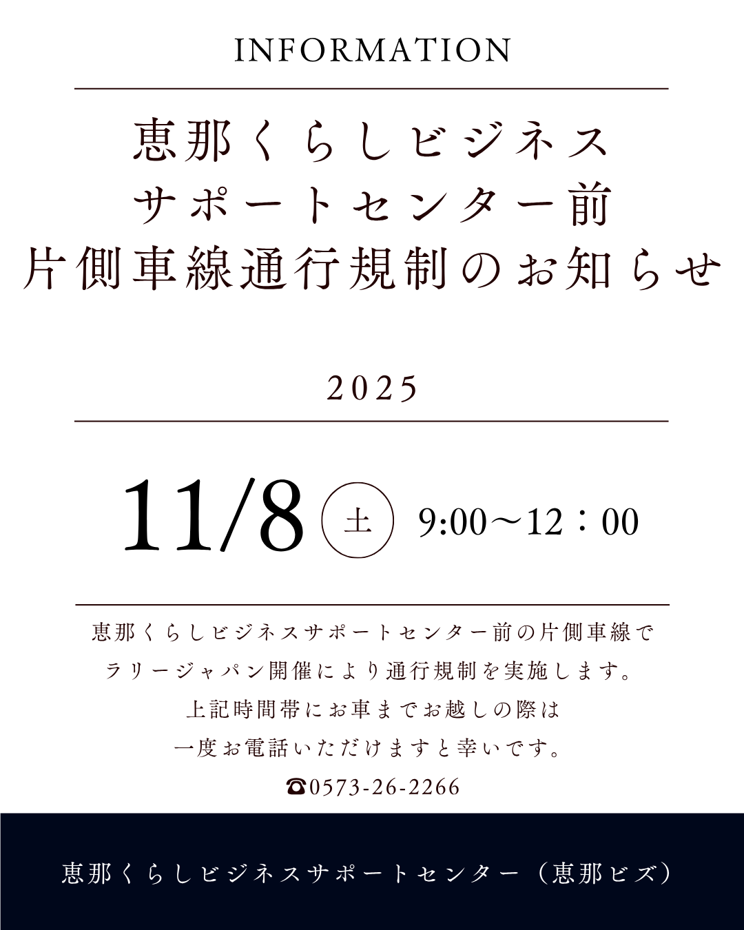 11月8日(土)の9:00~12:00の時間帯はラリージャパンの開催により、サポートセンター前の片側車線が通行規制となります。