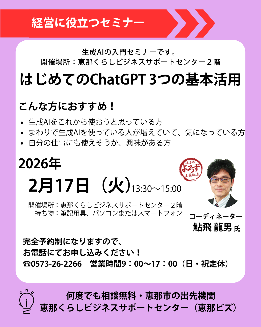 恵那くらしビジネスサポートセンターでは、中小企業の経営者を対象に専門家による個別相談会やセミナーを開催しています。あなたのお悩みに寄り添い、解決へのお手伝いをしますので、ぜひこの機会にご利用ください。