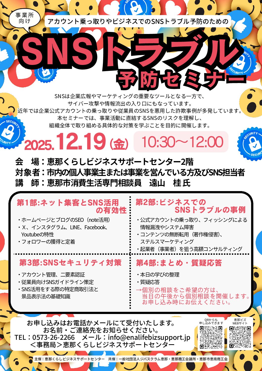 SNSは企業広報やマーケティングの重要なツールとなる一方で、サイバー攻撃や情報流出の入り口にもなっています。近年では企業公式アカウントの乗っ取りや従業員のSNSを悪用した詐欺事例が多発しています。本セミナーでは、事業活動に直結するSNSのリスクを理解し、組織全体で取り組める具体的な対策を学ぶことを目的に開催します。