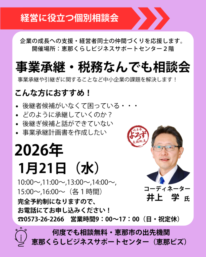 恵那くらしビジネスサポートセンターでは、専門家による経営に関する相談会を開催しています。